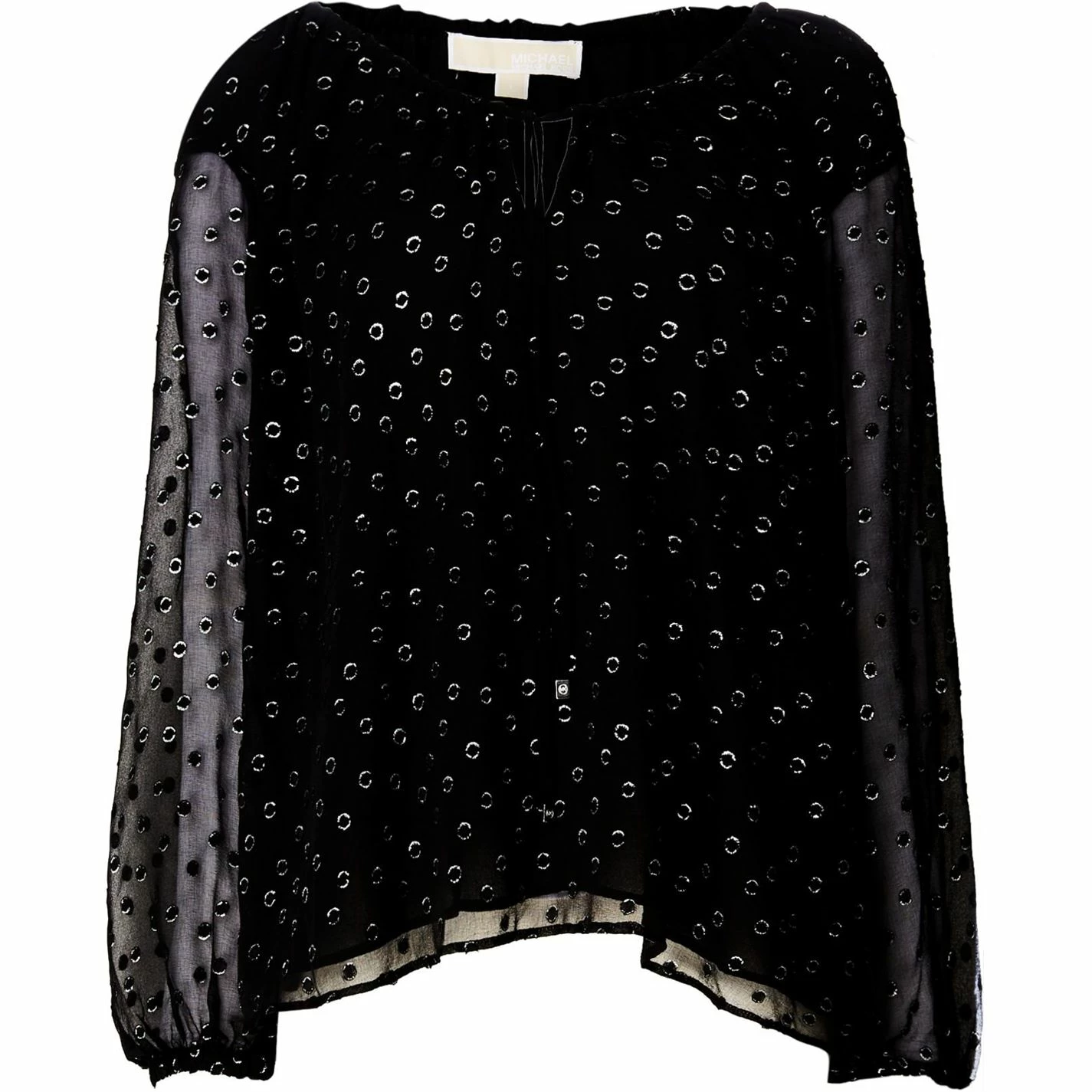 Pull off an urban edgy look with this blouse by michael Michael Kors. Made from a smooth fabric, it features semi-sheer long sleeves and drawstring fastening at the v-neckline for easy wear. Adorned with an all-over shimmery pattern to lend a distinctive touch, this blouse pairs well with faux leather leggings and high heels for a captivating ensemble.