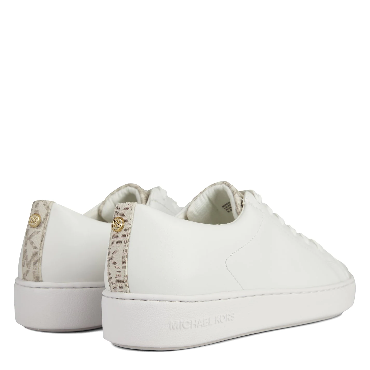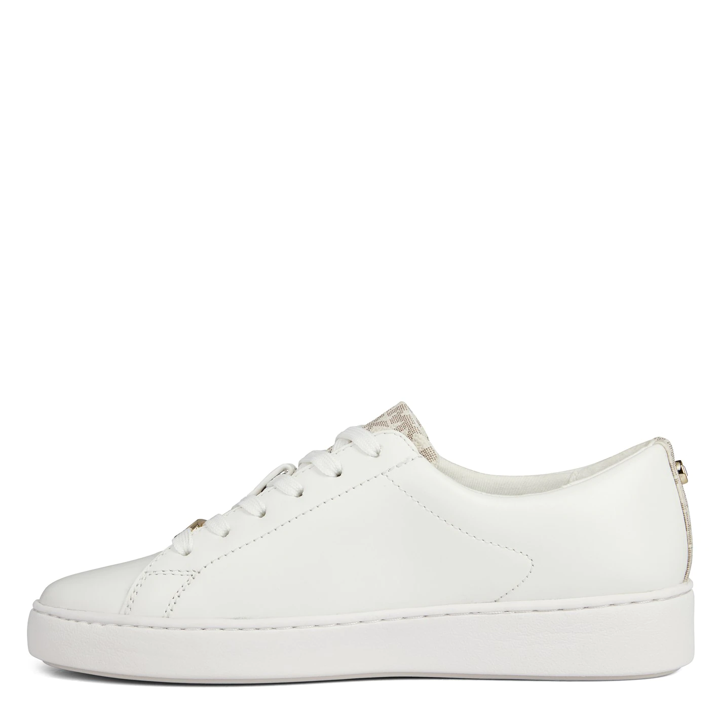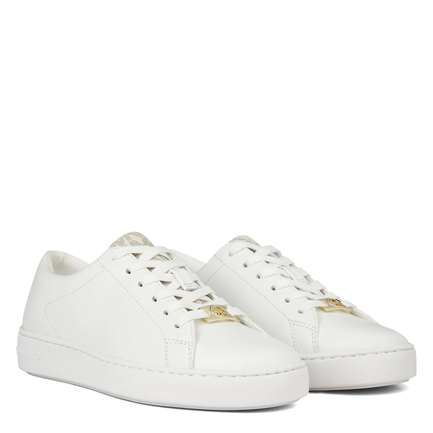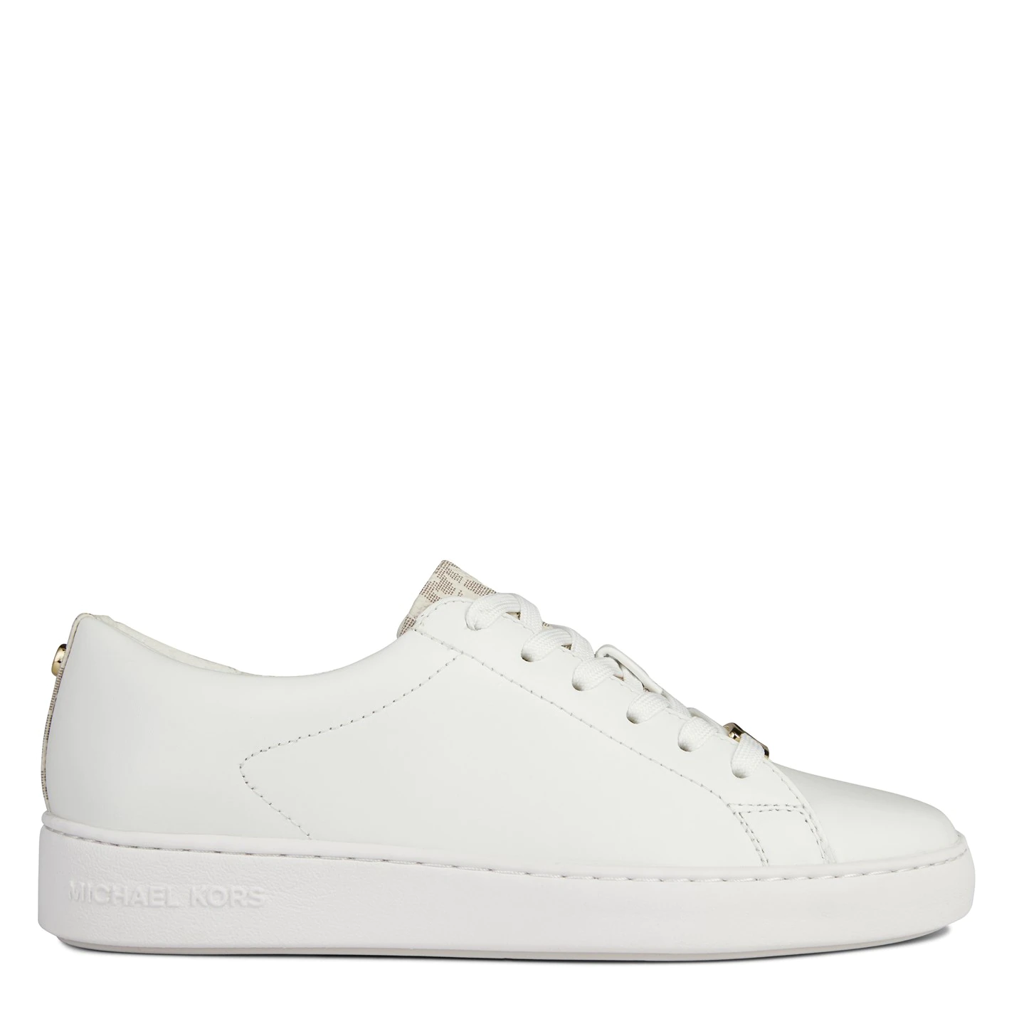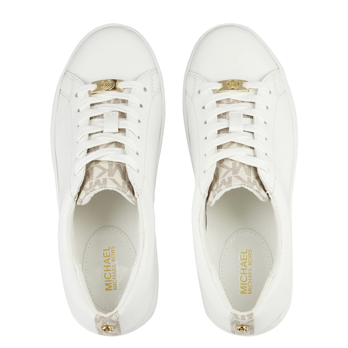 Elevate your casual attire with these Keaton Heart Trainers from MICHAEL Michael Kors. Crafted with a smooth leather upper, these playful trainers then come featuring a contrasting gold-toned branded stud to the rear and a gold toned branded metal-ware detail to the front for a sophisticated edge. Featuring a tonal lace up closure, on top of a chunky branded rubber sole, this pair are then stylishly finished with some all over MK trademark printing throughout for a designer appeal. Upper: leather. Lining: leather and textile. Sole: synthetic.