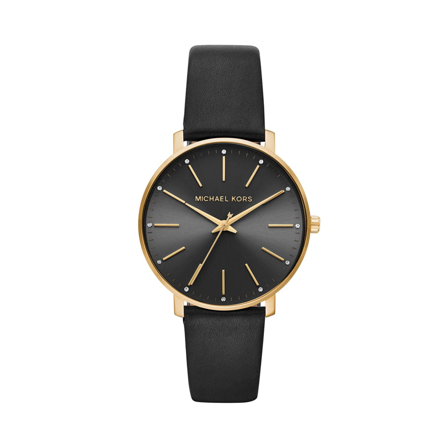 This 38mm Pyper watch features a black sunray dial with gold-tone stick indexes, three-hand movement and black leather strap.