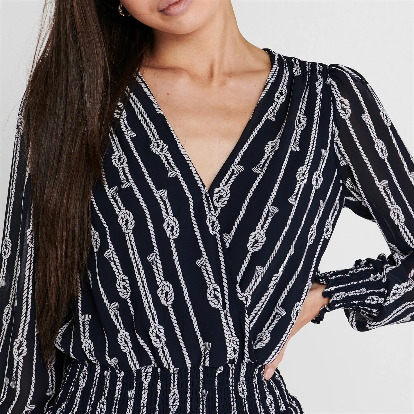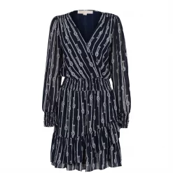 The Michael Michael Kors Long Sleeve Julia Mini Dress is party piece must have, featuring a deep v neck line, with wrap detail to the front, long sleeves and a wide elasticated trim to the waist for a comfortable fit. An all over rope and knot print coupled with the Michael Kors branding completes the look.