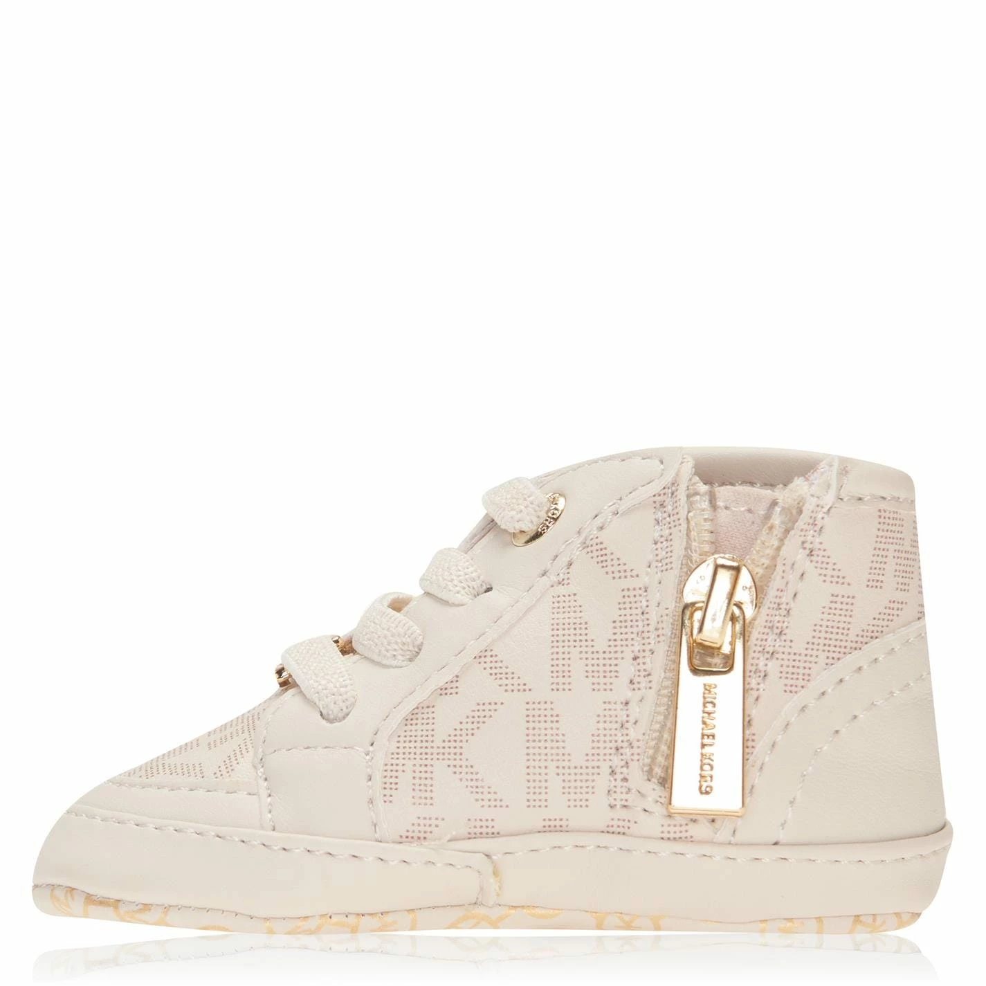 Invest in your little one’s wardrobe with the Michael Kors Ollie Crib Shoes. A high top construction with lace detailing and a side zip fastening to help achieve an easy on and off. The all-over monogram print will add a luxe aesthetic to your baby’s outfit with the gold toned hardware completing the design.