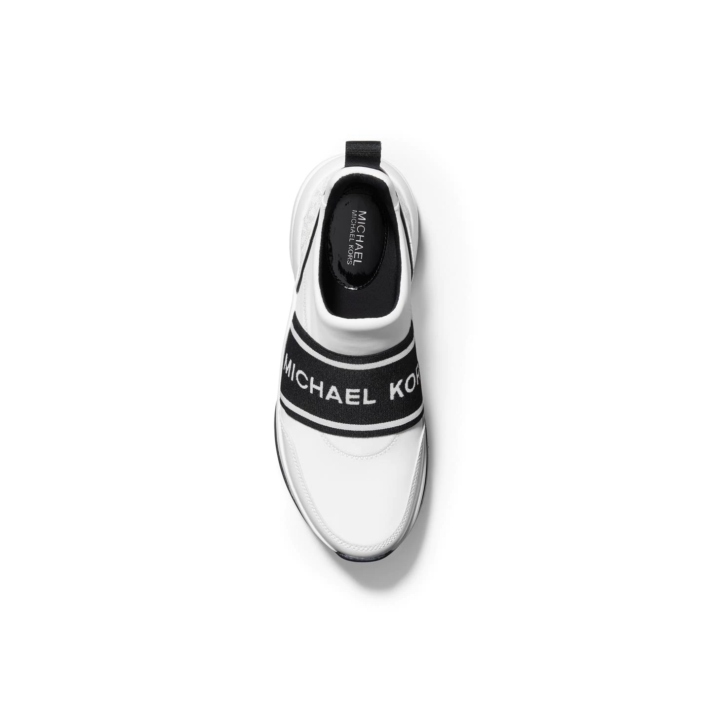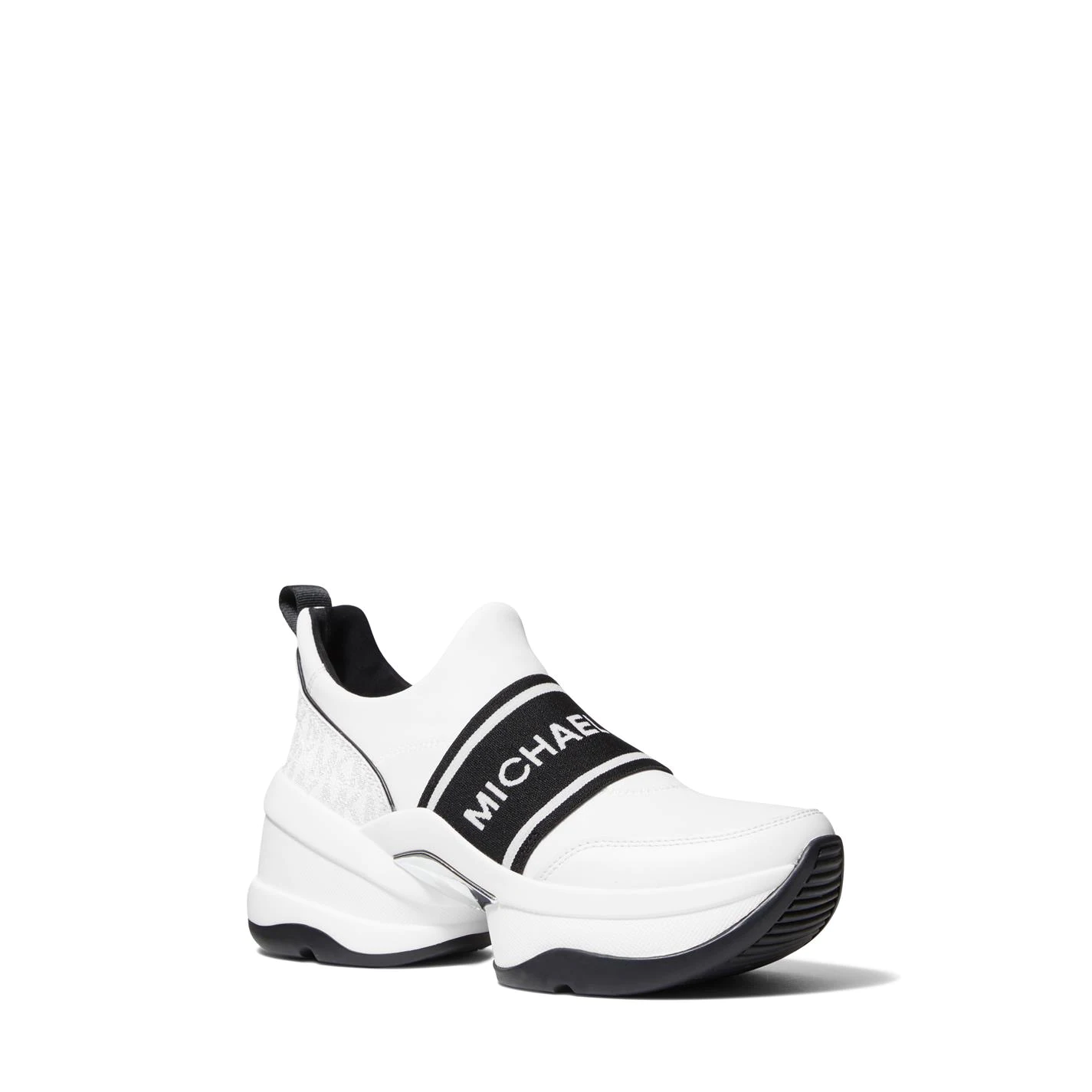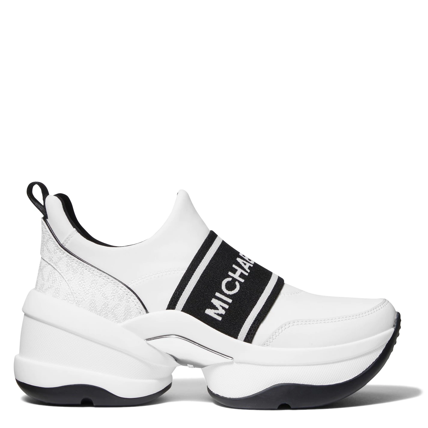 The Michael Kors Olympia Tape Trainers are a great addition to your casual wardrobe, crafted with a shaped ankle collar coupled with a wide elasticated strap across the forefoot and a pull tab to the heel for an easy on and off. A cushioned insole and midsole ensures comfort with every step, and a shaped outsole with contrasting detail gives a simple but stylish look, completed with the Michael Kors branding.