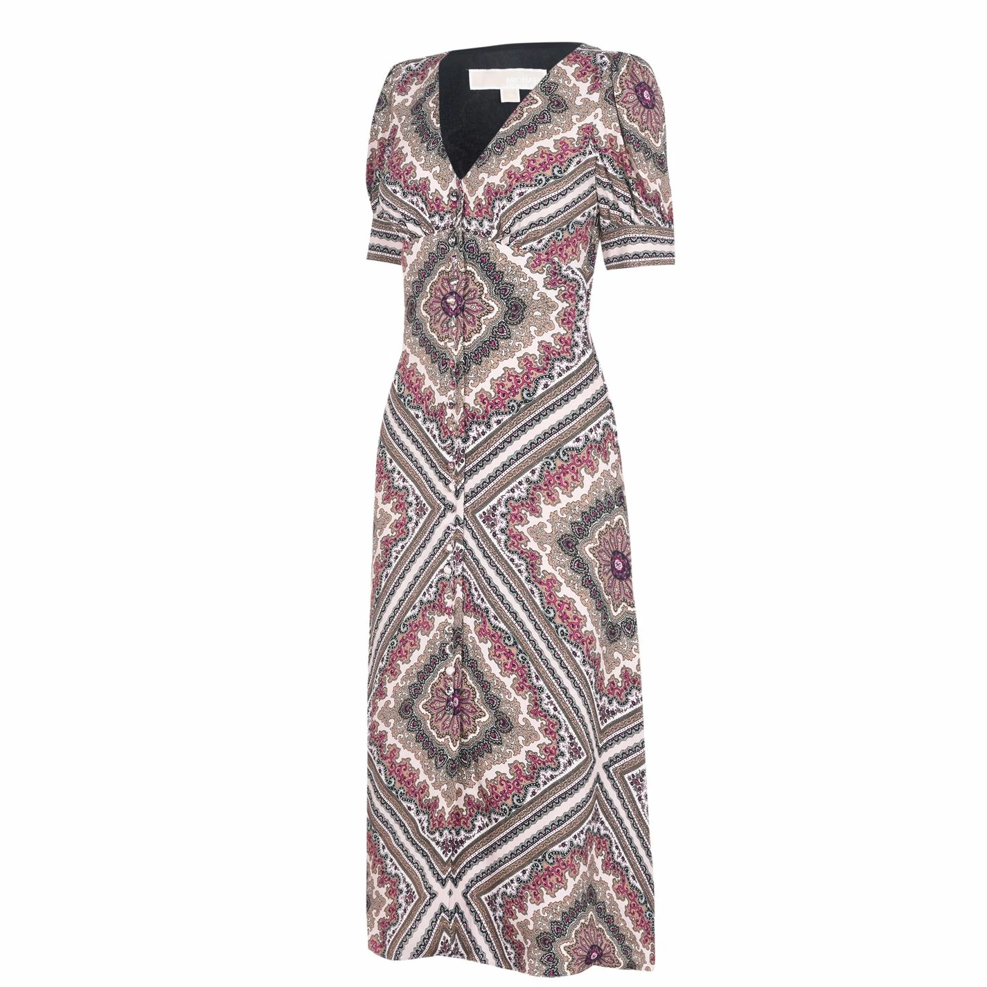 Upgrade your dress wardrobe with this Michael Kors Puff Sleeve Midi Dress, featuring a new romantic print style. The design hugs the torso before flowing out towards the hem, creating a flattering silhouette, aided by the elegant v-neckline. Fabric-covered buttons fasten the dress through the chest, while the puffed short sleeves add a further dimension to the piece.