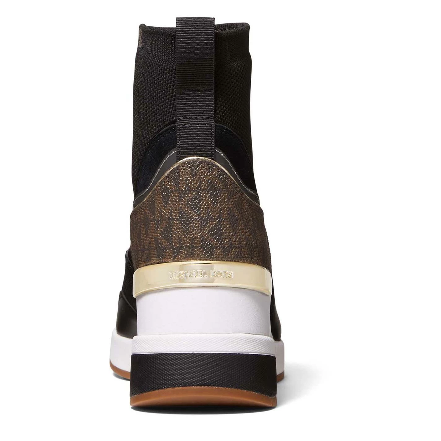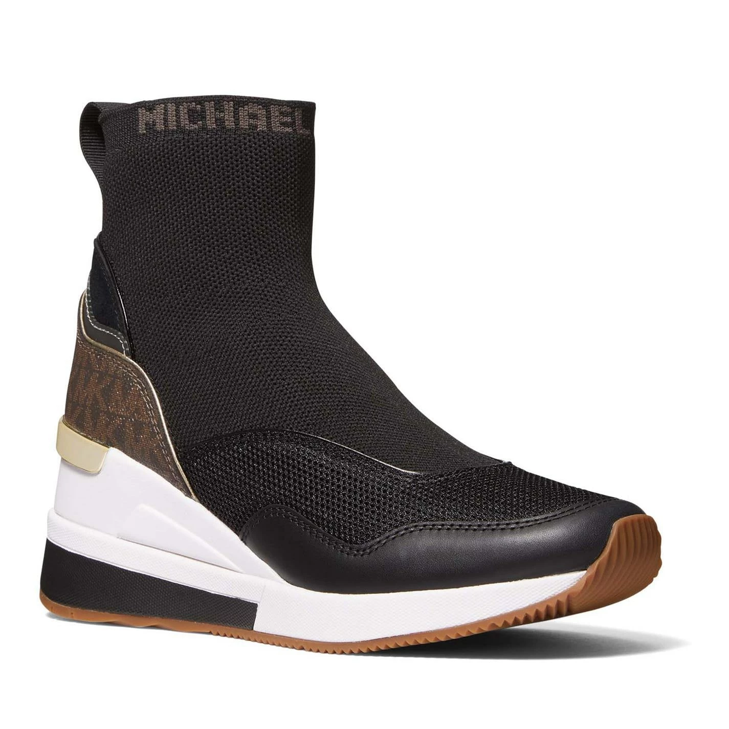 Designed with a modern twist, the Swift Knit Sock Sneaker by Michael Kors features an ankle-high sock silhouette made from a stretch-knit fabric accented with panels of leather boasting the signature MK print. Sat upon a two-tone wedge sole for ultimate comfort, these trainers are complete with Michael Kors branding to the upper for instant brand recognition for a casual off-duty look.